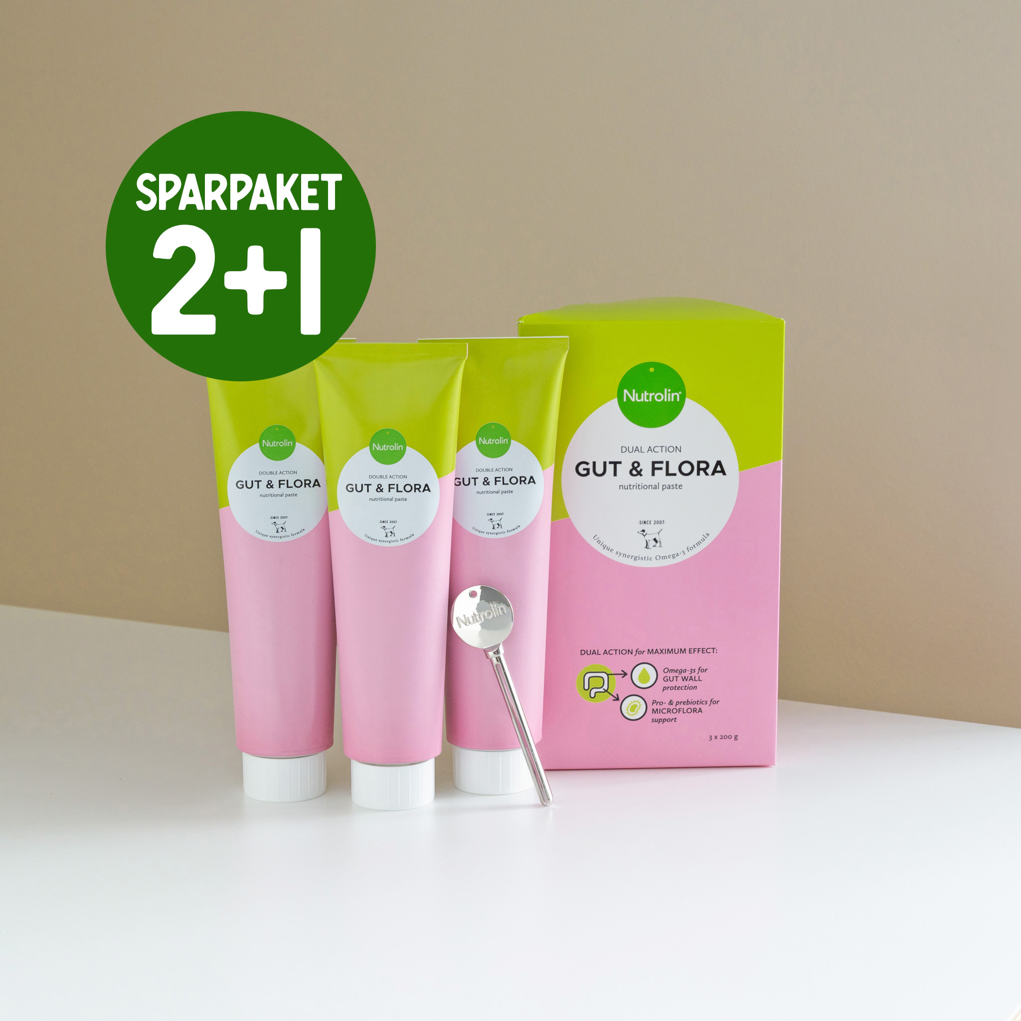 Tillsätt den smakliga Nutrolin® GUT & FLORA-pastan i din hunds eller katts mat en gång om dagen eller vid behov. En öppnad tub håller sig i två månader i rumstemperatur och i fyra månader i kylskåp.