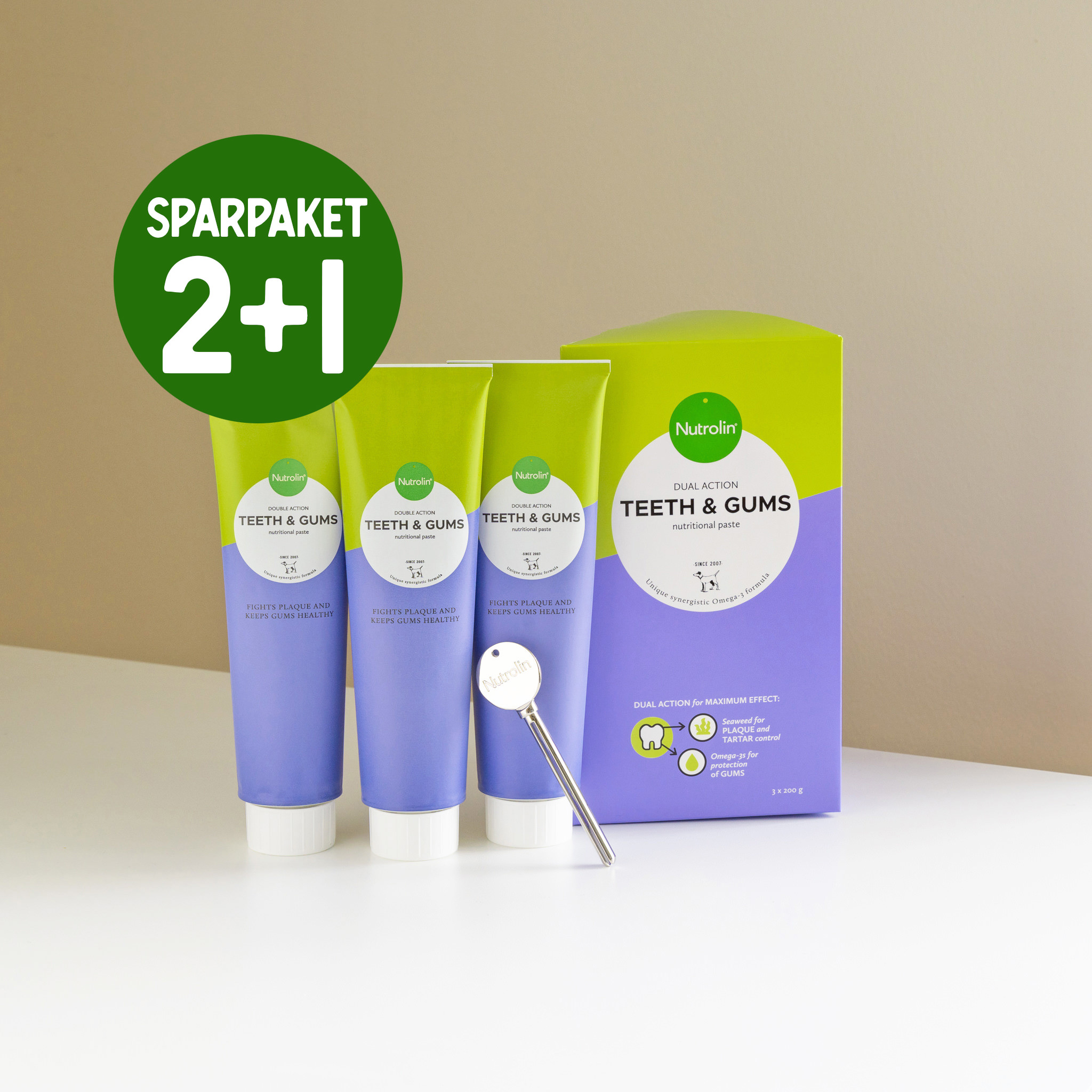 Tillsätt den smakliga Nutrolin® TEETH & GUMS-pastan i din hunds eller katts mat en gång om dagen. En öppnad tub håller sig i två månader i rumstemperatur och i fyra månader i kylskåp.